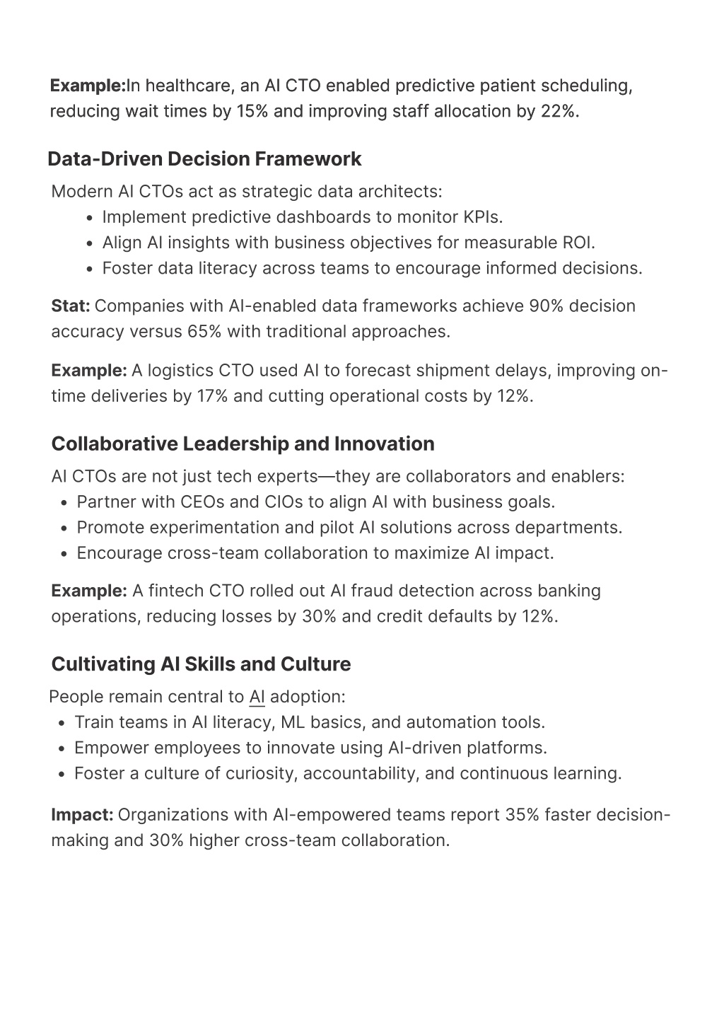 3. Example:In healthcare, an AI CTO enabled predictive patient scheduling, Example:In healthcare, an AI CTO enabled predictive patient scheduling, reducing wait times by 15% and improving staff allocation by 22%. reducing wait times by 15% and improving staff allocation by 22%. Data-Driven Decision Framework Modern AI CTOs act as strategic data architects: Implement predictive dashboards to monitor KPIs. Align AI insights with business objectives for measurable ROI. Foster data literacy across teams to encourage informed decisions. Stat: Companies with AI-enabled data frameworks achieve 90% decision accuracy versus 65% with traditional approaches. Example: A logistics CTO used AI to forecast shipment delays, improving on- time deliveries by 17% and cutting operational costs by 12%. Collaborative Leadership and Innovation AI CTOs are not just tech experts—they are collaborators and enablers: Partner with CEOs and CIOs to align AI with business goals. Promote experimentation and pilot AI solutions across departments. Encourage cross-team collaboration to maximize AI impact. Example: A fintech CTO rolled out AI fraud detection across banking operations, reducing losses by 30% and credit defaults by 12%. Cultivating AI Skills and Culture People remain central to AI adoption: Train teams in AI literacy, ML basics, and automation tools. Empower employees to innovate using AI-driven platforms. Foster a culture of curiosity, accountability, and continuous learning. Impact: Organizations with AI-empowered teams report 35% faster decision- making and 30% higher cross-team collaboration.
