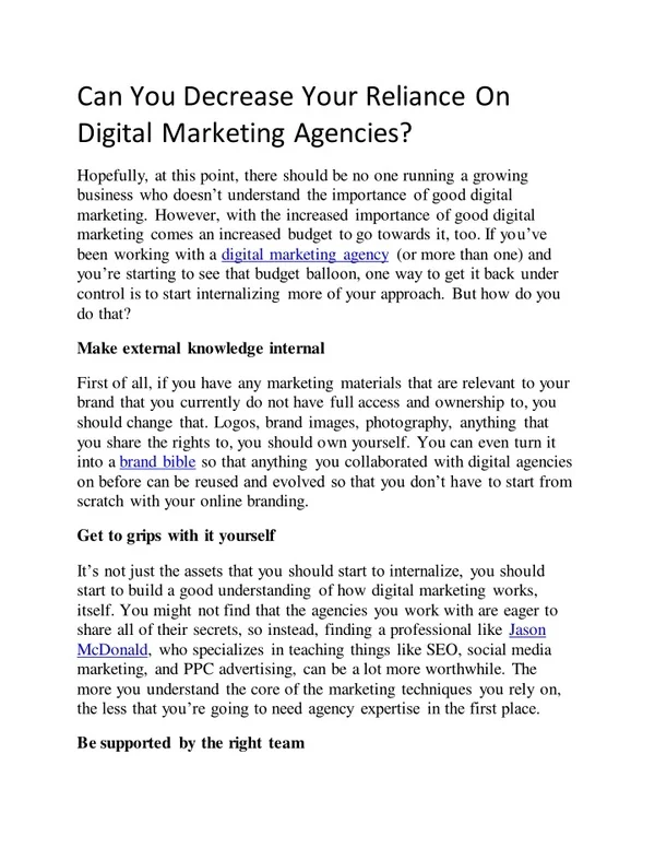 Can You Decrease Your Reliance On Digital Marketing Agencies? Hopefully, at this point, there should be no one running a growing business who doesn’t understand the importance of good digital marketing. However, with the increased importance of good digital marketing comes an increased budget to go towards it, too. If you’ve been working with a digital marketing agency (or more than one) and you’re starting to see that budget balloon, one way to get it back under control is to start internalizing more of your approach. But how do you do that? Make external knowledge internal First of all, if you have any marketing materials that are relevant to your brand that you currently do not have full access and ownership to, you should change that. Logos, brand images, photography, anything that you share the rights to, you should own yourself. You can even turn it into a brand bible so that anything you collaborated with digital agencies on before can be reused and evolved so that you don’t have to start from scratch with your online branding. Get to grips with it yourself It’s not just the assets that you should start to internalize, you should start to build a good understanding of how digital marketing works, itself. You might not find that the agencies you work with are eager to share all of their secrets, so instead, finding a professional like Jason McDonald, who specializes in teaching things like SEO, social media marketing, and PPC advertising, can be a lot more worthwhile. The more you understand the core of the marketing techniques you rely on, the less that you’re going to need agency expertise in the first place. Be supported by the right team