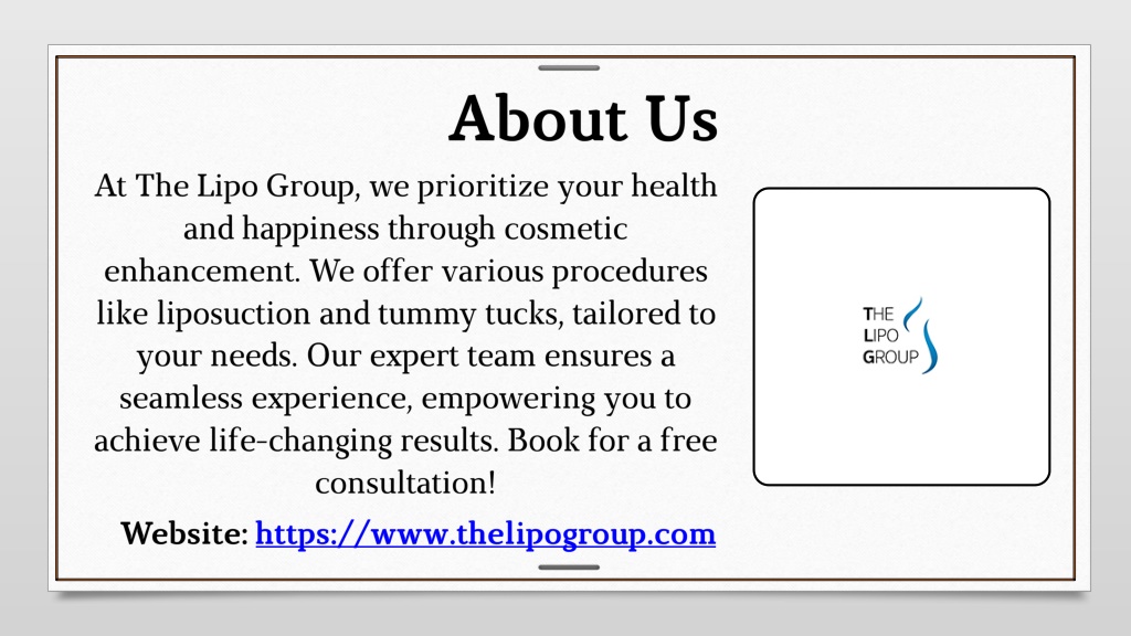 4. About Us At The Lipo Group, we prioritize your health and happiness through cosmetic enhancement. We offer various procedures like liposuction and tummy tucks, tailored to your needs. Our expert team ensures a seamless experience, empowering you to achieve life-changing results. Book for a free consultation! Website: https://www.thelipogroup.com