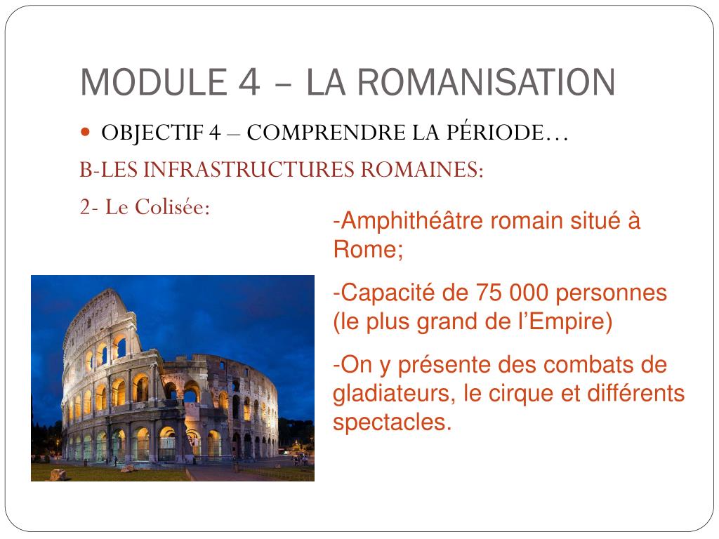 MODULE 4 – LA ROMANISATION OBJECTIF 4 – COMPRENDRE LA PÉRIODE… B-LES INFRASTRUCTURES ROMAINES: 2- Le Colisée: -Amphithéâtre romain situé à Rome; -Capacité de 75 000 personnes (le plus grand de l’Empire) -On y présente des combats de gladiateurs, le cirque et différents spectacles.