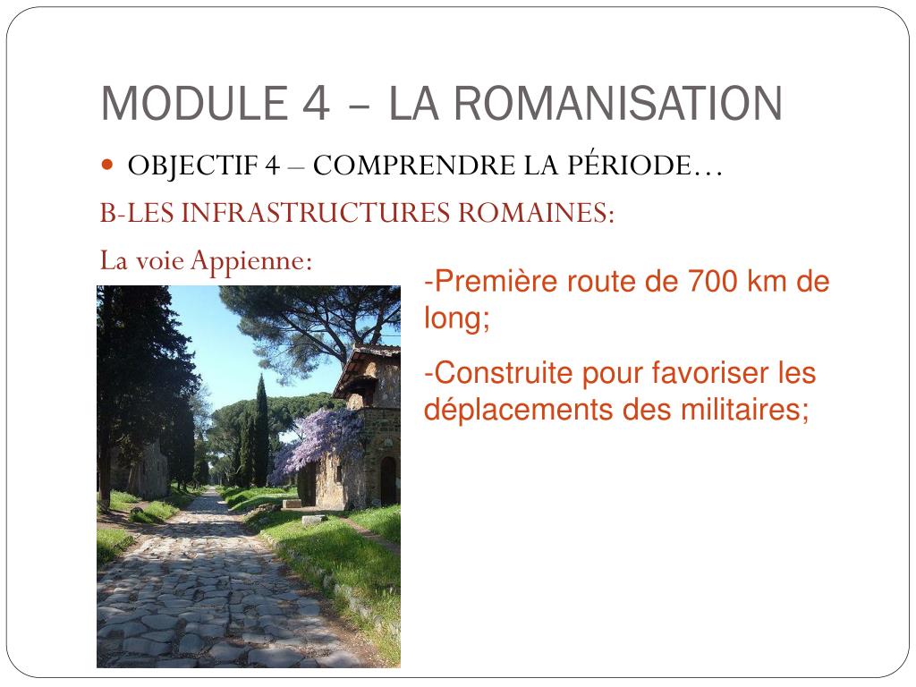 MODULE 4 – LA ROMANISATION OBJECTIF 4 – COMPRENDRE LA PÉRIODE… B-LES INFRASTRUCTURES ROMAINES: 1-Les voies romaines : -Déplacements plus rapides; -Installer rapidement l’armée en cas de guerre; -Favorise les échanges commerciaux ;