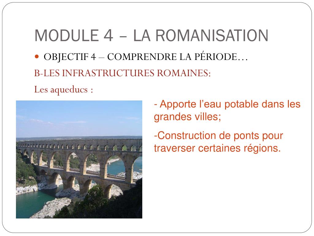 MODULE 4 – LA ROMANISATION OBJECTIF 4 – COMPRENDRE LA PÉRIODE… B-LES INFRASTRUCTURES ROMAINES: Les aqueducs : • Apporte l’eau potable dans les grandes villes; • Construction de ponts pour traverser certaines régions.