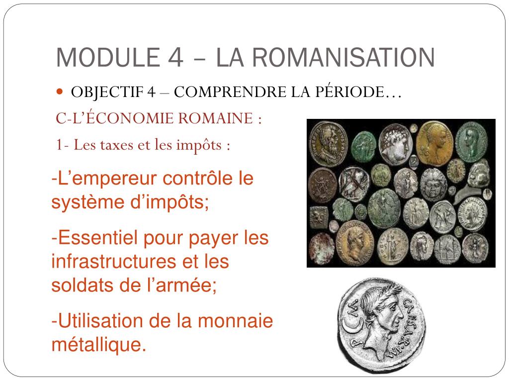 MODULE 4 – LA ROMANISATION OBJECTIF 4 – COMPRENDRE LA PÉRIODE… C-L’ÉCONOMIE ROMAINE : 1- Les taxes et les impôts : • L’empereur contrôle le système d’impôts; • Essentiel pour payer les infrastructures et les soldats de l’armée; • Utilisation de la monnaie métallique.
