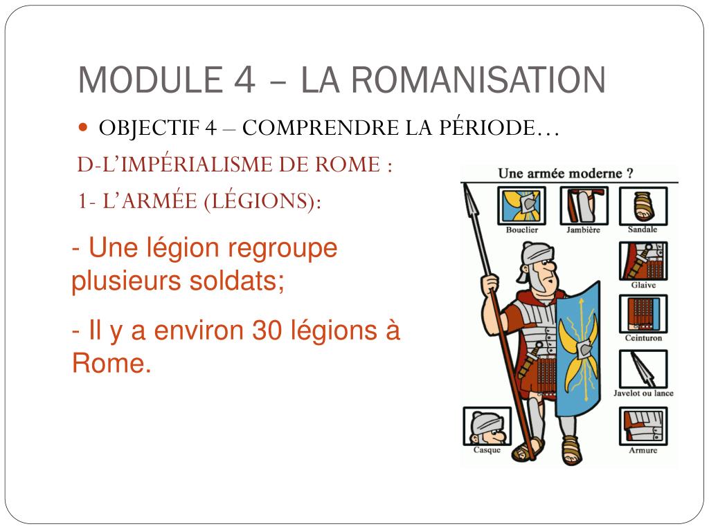 MODULE 4 – LA ROMANISATION OBJECTIF 4 – COMPRENDRE LA PÉRIODE… D-L’IMPÉRIALISME DE ROME : 1- L’ARMÉE (LÉGIONS): • Une légion regroupe plusieurs soldats; • Il y a environ 30 légions à Rome.