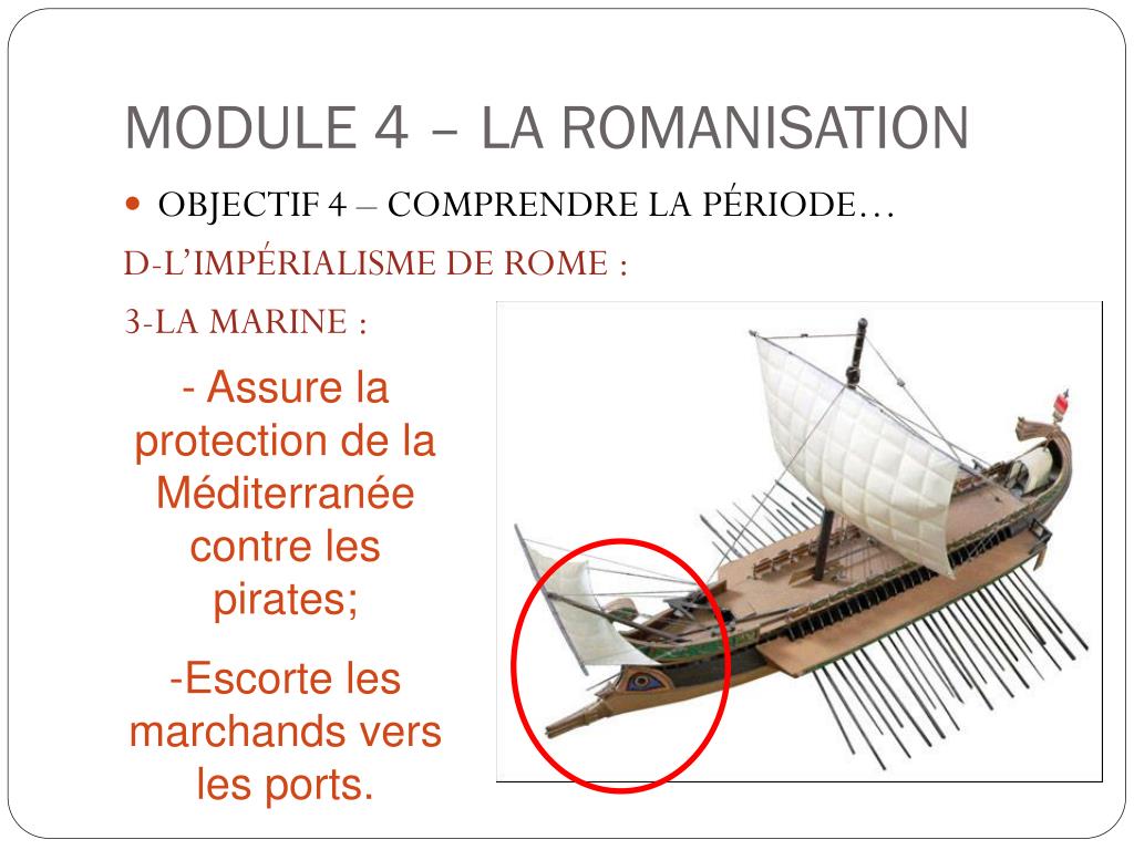 MODULE 4 – LA ROMANISATION OBJECTIF 4 – COMPRENDRE LA PÉRIODE… D-L’IMPÉRIALISME DE ROME : 3-LA MARINE : • Assure la protection de la Méditerranée contre les pirates; • Escorte les marchands vers les ports.