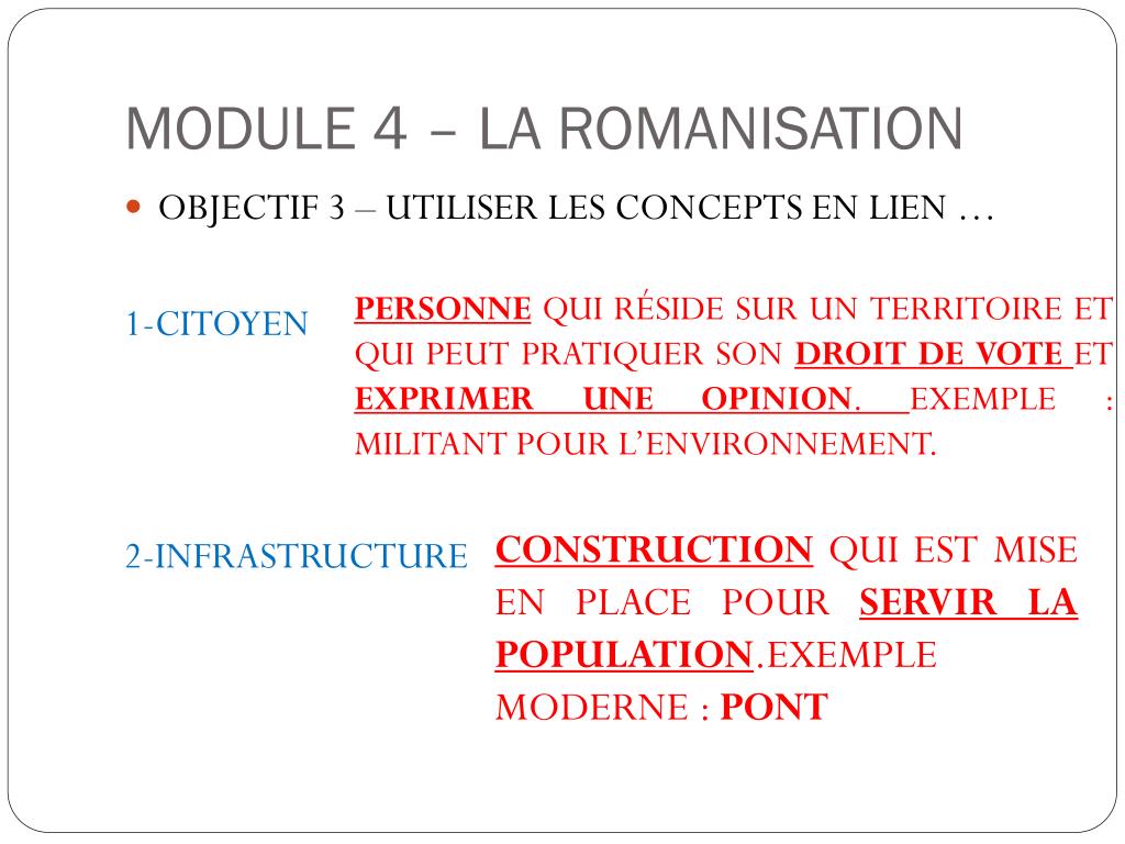 MODULE 4 – LA ROMANISATION • OBJECTIF 3 – UTILISER LES CONCEPTS EN LIEN … 1-CITOYEN 2-INFRASTRUCTURE PERSONNE QUI RÉSIDE SUR UN TERRITOIRE ET QUI PEUT PRATIQUER SON DROIT DE VOTE ETEXPRIMER UNE OPINION. EXEMPLE : MILITANT POUR L’ENVIRONNEMENT. CONSTRUCTION QUI EST MISE EN PLACE POUR SERVIR LA POPULATION.EXEMPLE MODERNE : PONT