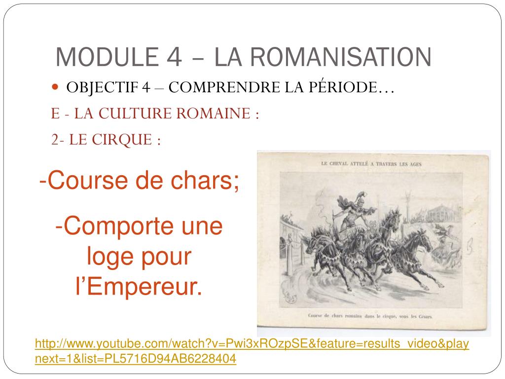 MODULE 4 – LA ROMANISATION OBJECTIF 4 – COMPRENDRE LA PÉRIODE… E - LA CULTURE ROMAINE : 2- LE CIRQUE : -Course de chars; -Comporte une loge pour l’Empereur. http://www.youtube.com/watch?v=Pwi3xROzpSE&feature=results_video&playnext=1&list=PL5716D94AB6228404