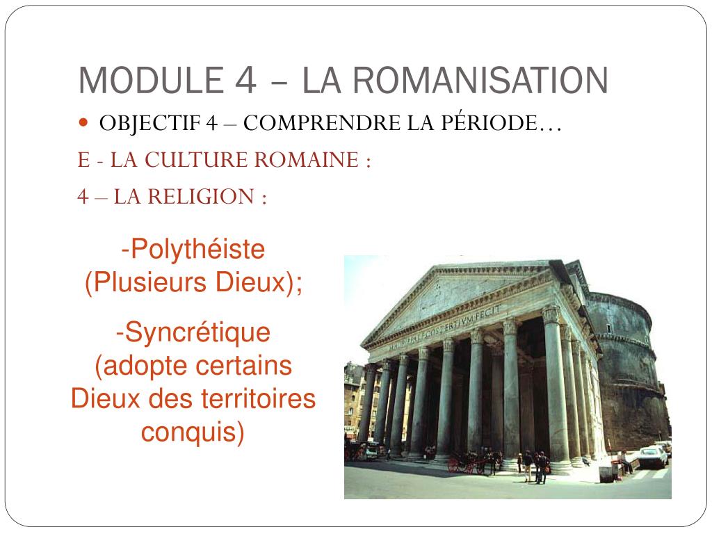 MODULE 4 – LA ROMANISATION OBJECTIF 4 – COMPRENDRE LA PÉRIODE… E - LA CULTURE ROMAINE : 4 – LA RELIGION : -Polythéiste (Plusieurs Dieux); -Syncrétique (adopte certains Dieux des territoires conquis)