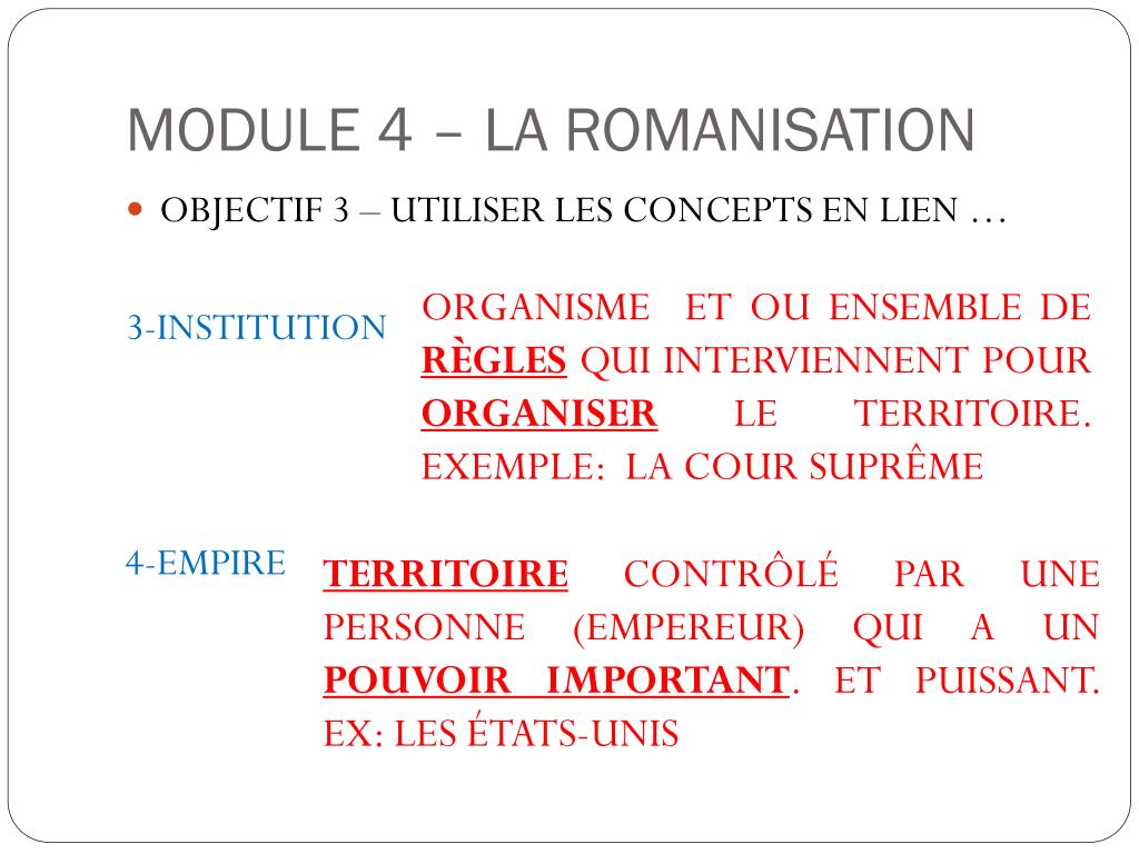 MODULE 4 – LA ROMANISATION • OBJECTIF 3 – UTILISER LES CONCEPTS EN LIEN … 3-INSTITUTION 4-EMPIRE ORGANISME ET OU ENSEMBLE DE RÈGLES QUI INTERVIENNENT POUR ORGANISER LE TERRITOIRE. EXEMPLE: LA COUR SUPRÊME TERRITOIRE CONTRÔLÉ PAR UNE PERSONNE (EMPEREUR) QUI A UN POUVOIR IMPORTANT. ET PUISSANT. EX: LES ÉTATS-UNIS