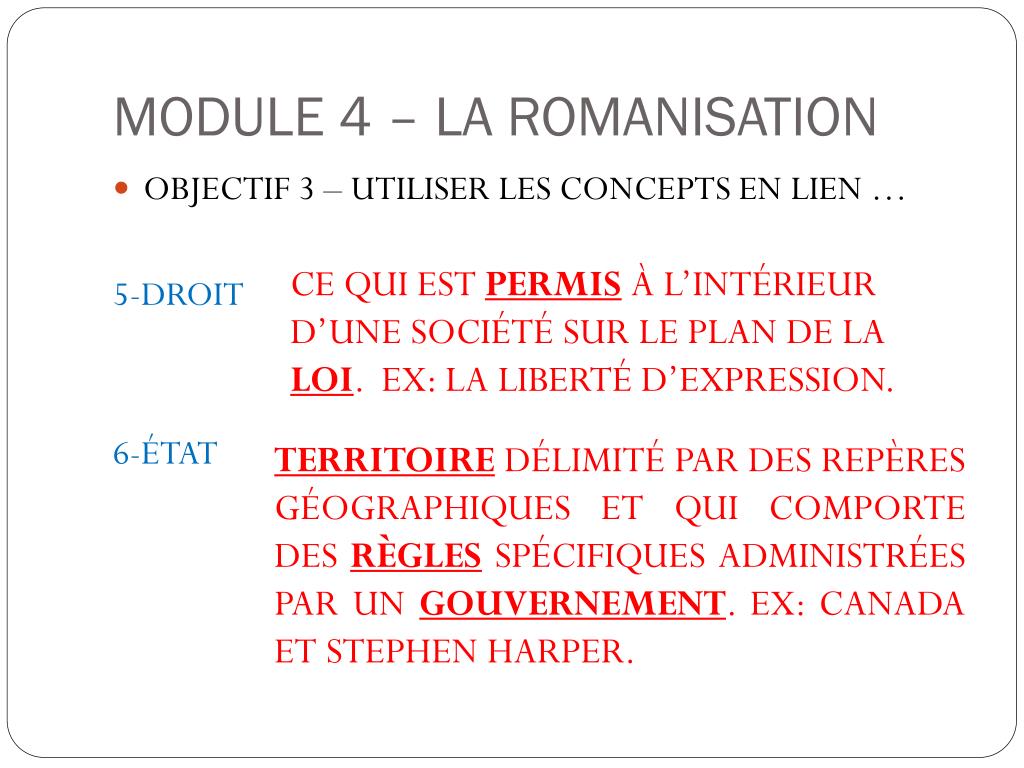 MODULE 4 – LA ROMANISATION • OBJECTIF 3 – UTILISER LES CONCEPTS EN LIEN … 5-DROIT 6-ÉTAT CE QUI EST PERMIS À L’INTÉRIEUR D’UNE SOCIÉTÉ SUR LE PLAN DE LA LOI. EX: LA LIBERTÉ D’EXPRESSION. TERRITOIRE DÉLIMITÉ PAR DES REPÈRES GÉOGRAPHIQUES ET QUI COMPORTE DES RÈGLES SPÉCIFIQUES ADMINISTRÉES PAR UN GOUVERNEMENT. EX: CANADA ET STEPHEN HARPER.