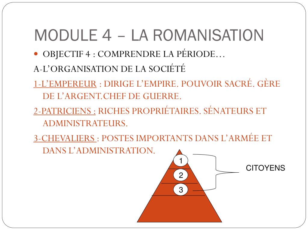 MODULE 4 – LA ROMANISATION • OBJECTIF 4 : COMPRENDRE LA PÉRIODE… A-L’ORGANISATION DE LA SOCIÉTÉ 1-L’EMPEREUR : DIRIGE L’EMPIRE. POUVOIR SACRÉ. GÈRE DE L’ARGENT.CHEF DE GUERRE. 2-PATRICIENS : RICHES PROPRIÉTAIRES. SÉNATEURS ET ADMINISTRATEURS. 3-CHEVALIERS : POSTES IMPORTANTS DANS L’ARMÉE ET DANS L’ADMINISTRATION. 1 CITOYENS 2 3