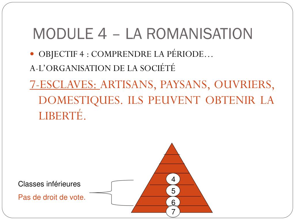 MODULE 4 – LA ROMANISATION 4 Classes inférieures Pas de droit de vote. 5 6 OBJECTIF 4 : COMPRENDRE LA PÉRIODE… A-L’ORGANISATION DE LA SOCIÉTÉ 7-ESCLAVES: ARTISANS, PAYSANS, OUVRIERS, DOMESTIQUES. ILS PEUVENT OBTENIR LA LIBERTÉ. 7