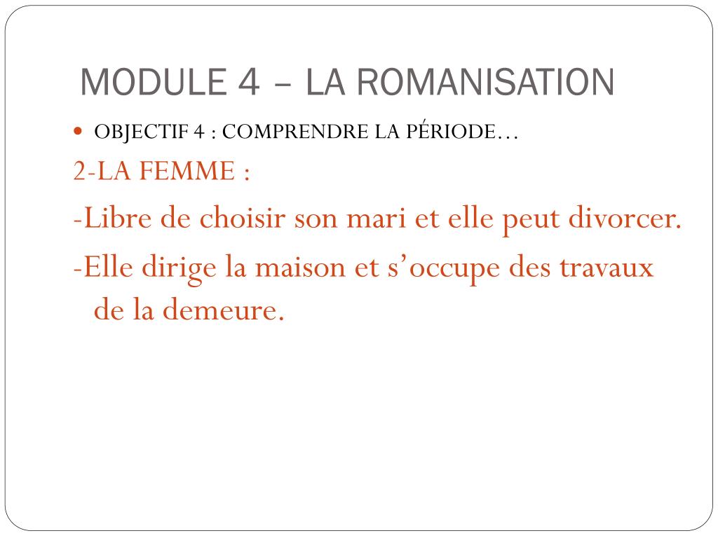 MODULE 4 – LA ROMANISATION OBJECTIF 4 : COMPRENDRE LA PÉRIODE… 2-LA FEMME : -Libre de choisir son mari et elle peut divorcer. -Elle dirige la maison et s’occupe des travaux de la demeure.