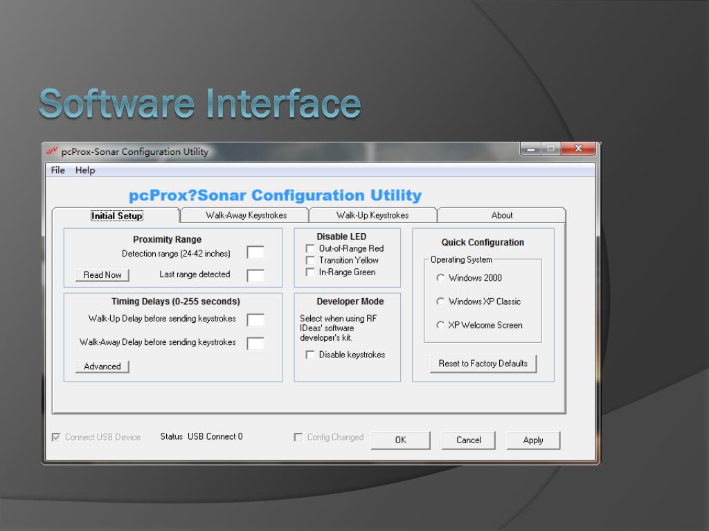 RF IDeas pcProx Sonar (specifications) Typical read range: Adjustable 14” – 60” (35.56cm – 152.40cm) Dimensions: 1.75” x 1.75” x 7/8” (4.45cm x 4.45cm x 2.2cm) Weight: .4 lbs (181.4.g) Power requirements and interface: 5V via USB port LED: Red, amber and green Transmit frequency: 40 kHz Operating temperature range: 40° to 120°F (4.44° to 48.8°C) Operating humidity range: 0% to 95% relative humidity, non-condensing Motion Sensor