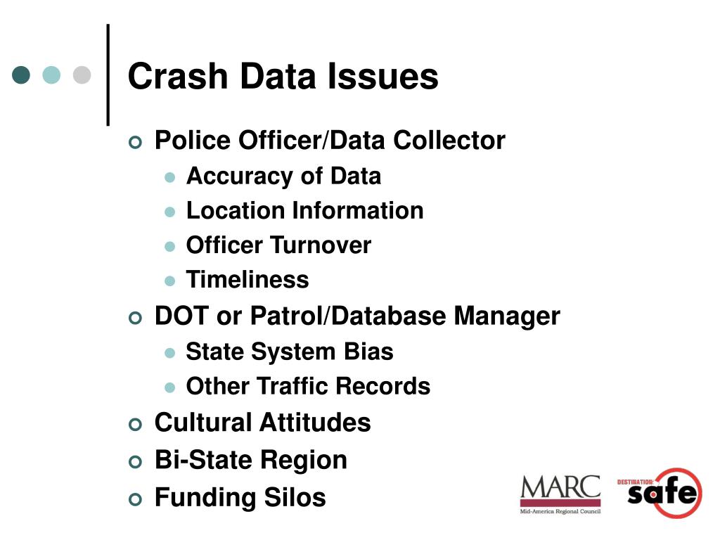 Crash Data Issues • Police Officer/Data Collector • Accuracy of Data • Location Information • Officer Turnover • Timeliness • DOT or Patrol/Database Manager • State System Bias • Other Traffic Records • Cultural Attitudes • Bi-State Region • Funding Silos