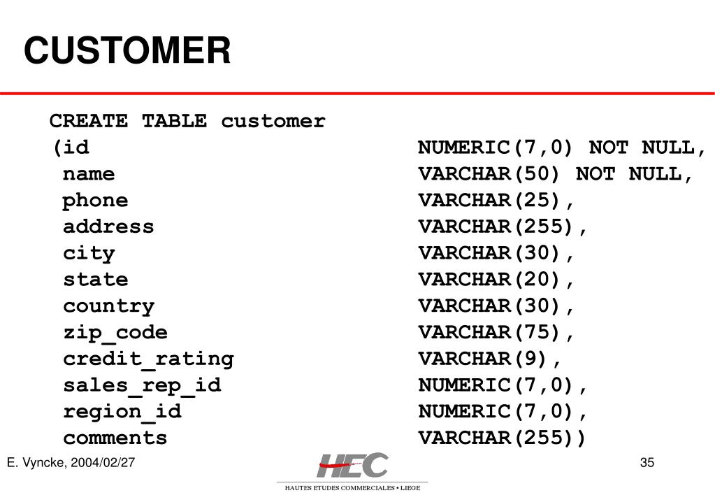 CUSTOMER • CREATE TABLE customer • (id NUMERIC(7,0) NOT NULL, • name VARCHAR(50) NOT NULL, • phone VARCHAR(25), • address VARCHAR(255), • city VARCHAR(30), • state VARCHAR(20), • country VARCHAR(30), • zip_code VARCHAR(75), • credit_rating VARCHAR(9), • sales_rep_id NUMERIC(7,0), • region_id NUMERIC(7,0), • comments VARCHAR(255))
