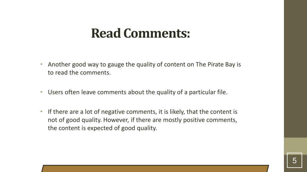 Read Comments: • Another good way to gauge the quality of content on The Pirate Bay is to read the comments. • Users often leave comments about the quality of a particular file. • If there are a lot of negative comments, it is likely, that the content is not of good quality. However, if there are mostly positive comments, the content is expected of good quality. 5
