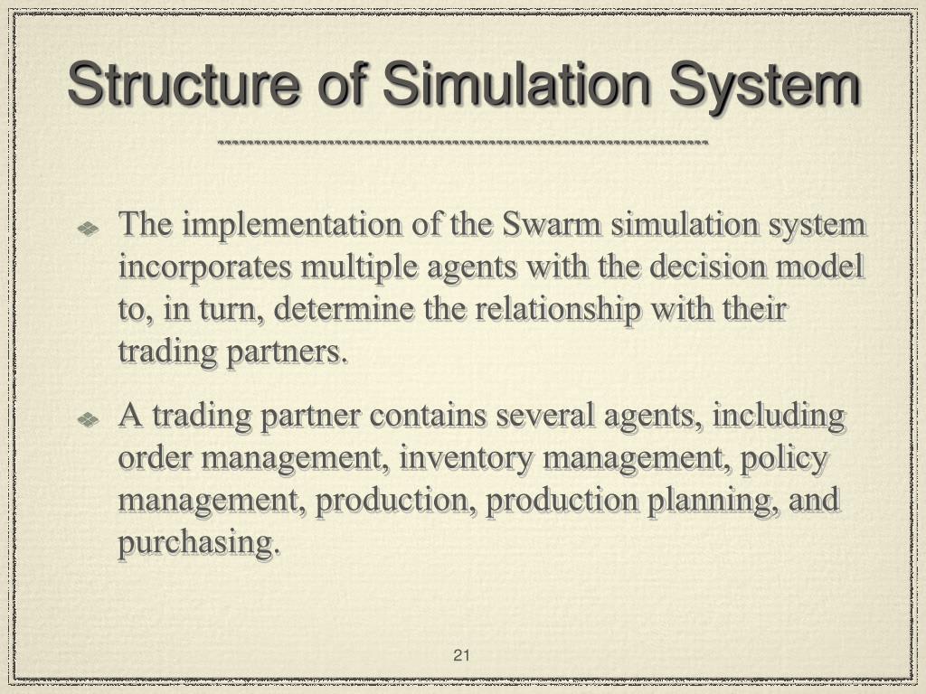 Structure of Simulation System • The implementation of the Swarm simulation system incorporates multiple agents with the decision model to, in turn, determine the relationship with their trading partners. • A trading partner contains several agents, including order management, inventory management, policy management, production, production planning, and purchasing. 21