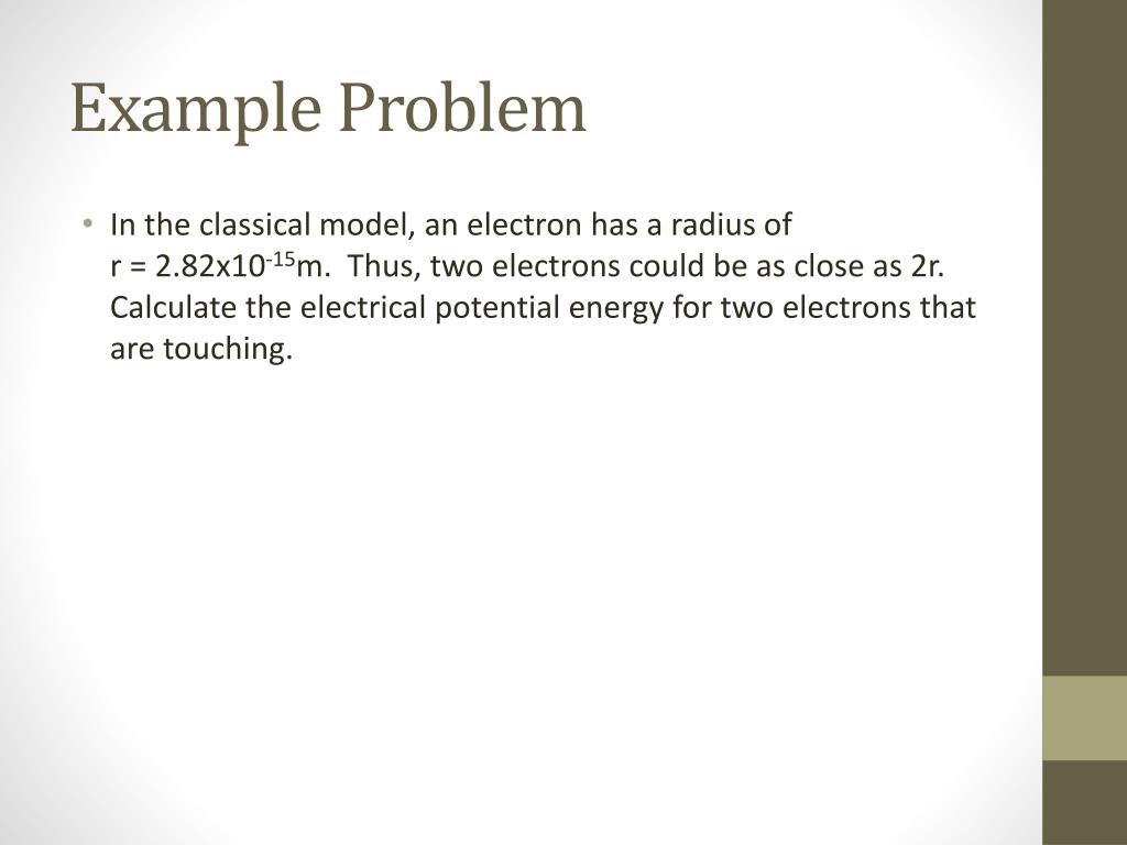 Example Problem • In the classical model, an electron has a radius of r = 2.82x10-15m. Thus, two electrons could be as close as 2r. Calculate the electrical potential energy for two electrons that are touching.