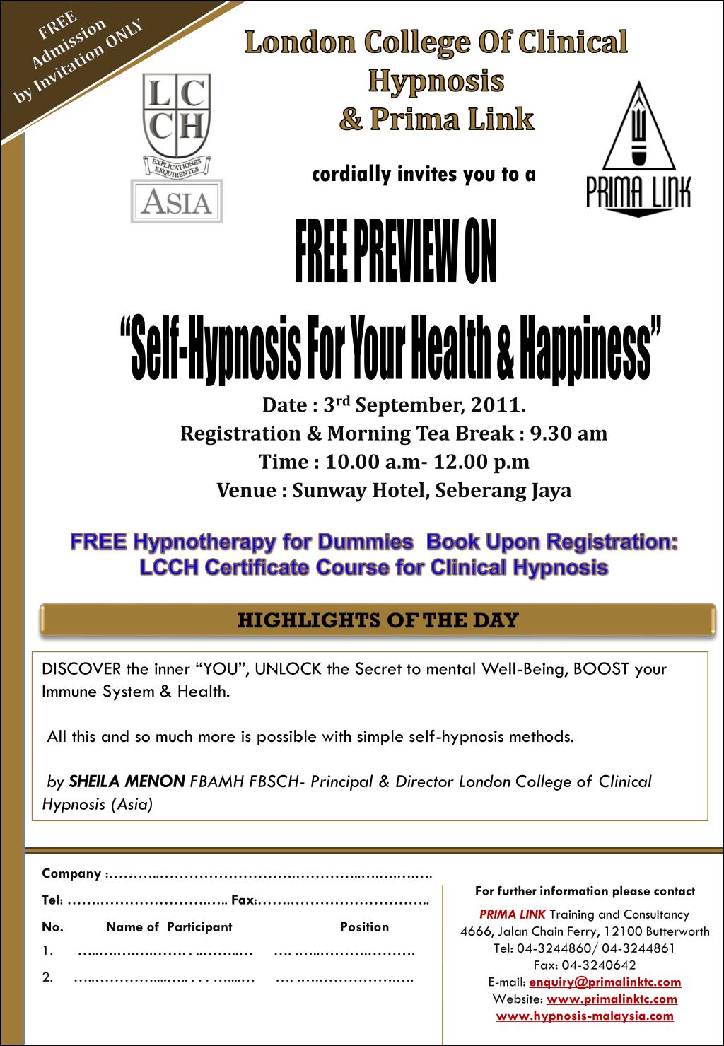 FREE Admission by Invitation ONLY. London College Of Clinical Hypnosis & Prima Link. cordially invites you to a. FREE PREVIEW ON “Self-Hypnosis For Your Health & Happiness”. Date : 3 rd September, 2011. Registration & Morning Tea Break : 9.30 am Time : 10.00 a.m - 12.00 p.m