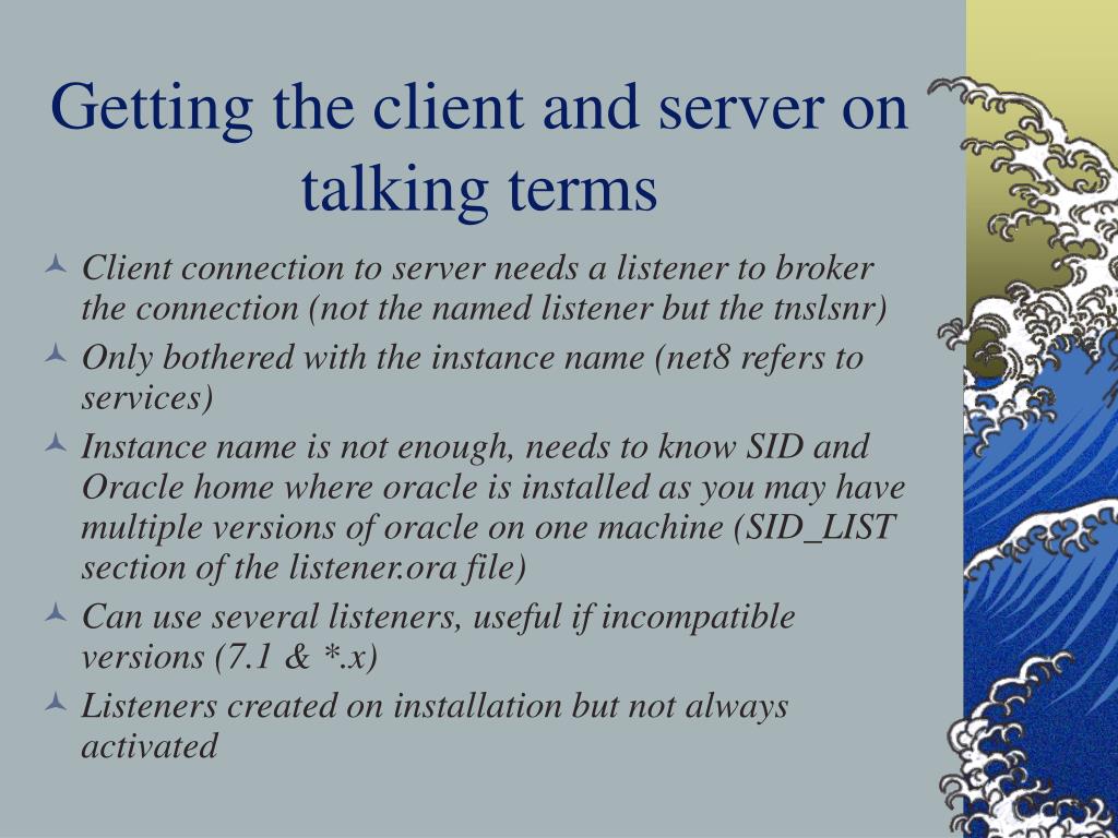 Getting the client and server on talking terms • Client connection to server needs a listener to broker the connection (not the named listener but the tnslsnr) • Only bothered with the instance name (net8 refers to services) • Instance name is not enough, needs to know SID and Oracle home where oracle is installed as you may have multiple versions of oracle on one machine (SID_LIST section of the listener.ora file) • Can use several listeners, useful if incompatible versions (7.1 & *.x) • Listeners created on installation but not always activated
