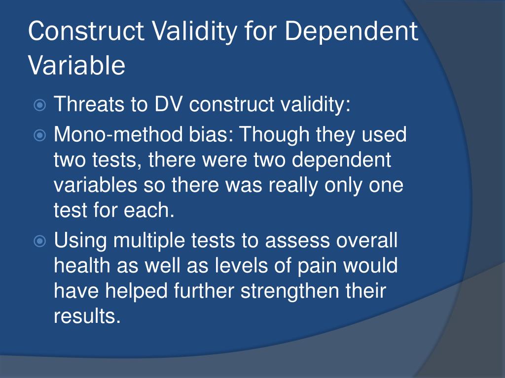 Construct Validity for Dependent Variable • Threats to DV construct validity: • Mono-method bias: Though they used two tests, there were two dependent variables so there was really only one test for each. • Using multiple tests to assess overall health as well as levels of pain would have helped further strengthen their results.