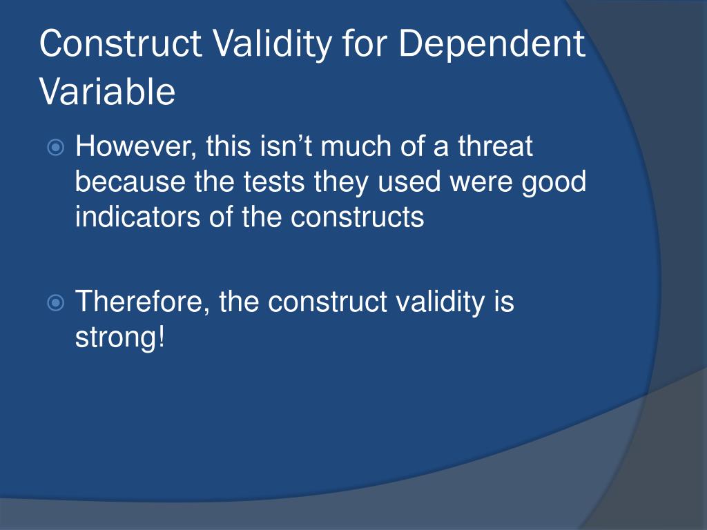 Construct Validity for Dependent Variable • However, this isn’t much of a threat because the tests they used were good indicators of the constructs • Therefore, the construct validity is strong!