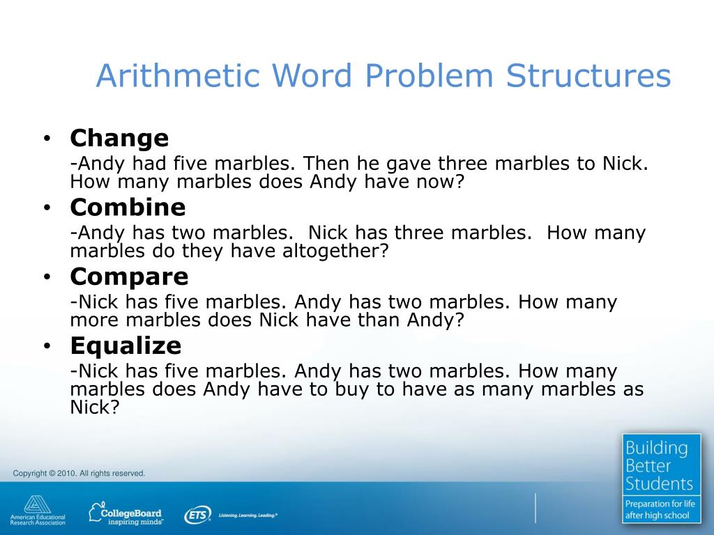 Arithmetic Word Problem Structures • Change -Andy had five marbles. Then he gave three marbles to Nick. How many marbles does Andy have now? • Combine -Andy has two marbles. Nick has three marbles. How many marbles do they have altogether? • Compare -Nick has five marbles. Andy has two marbles. How many more marbles does Nick have than Andy? • Equalize -Nick has five marbles. Andy has two marbles. How many marbles does Andy have to buy to have as many marbles as Nick?