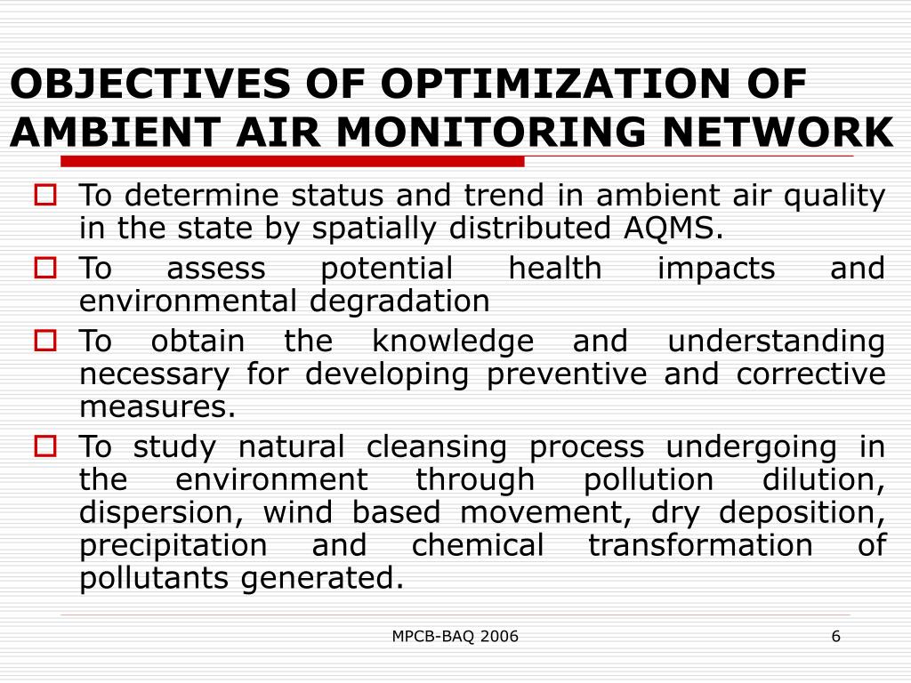 OBJECTIVES OF OPTIMIZATION OF AMBIENT AIR MONITORING NETWORK • To determine status and trend in ambient air quality in the state by spatially distributed AQMS. • To assess potential health impacts and environmental degradation • To obtain the knowledge and understanding necessary for developing preventive and corrective measures. • To study natural cleansing process undergoing in the environment through pollution dilution, dispersion, wind based movement, dry deposition, precipitation and chemical transformation of pollutants generated. MPCB-BAQ 2006
