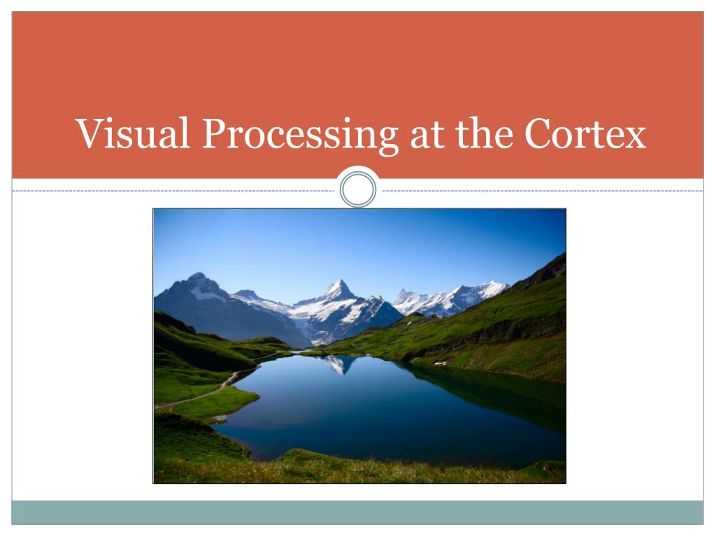 Retina Cortex • Info (shape, color, etc) to thalamus • Parvocellular cells – small, fine detail (cones) • Magnocellular cells – large, movement (rods) • To cortex for further processing Different aspects of stimulus processed separately! Still highly organized