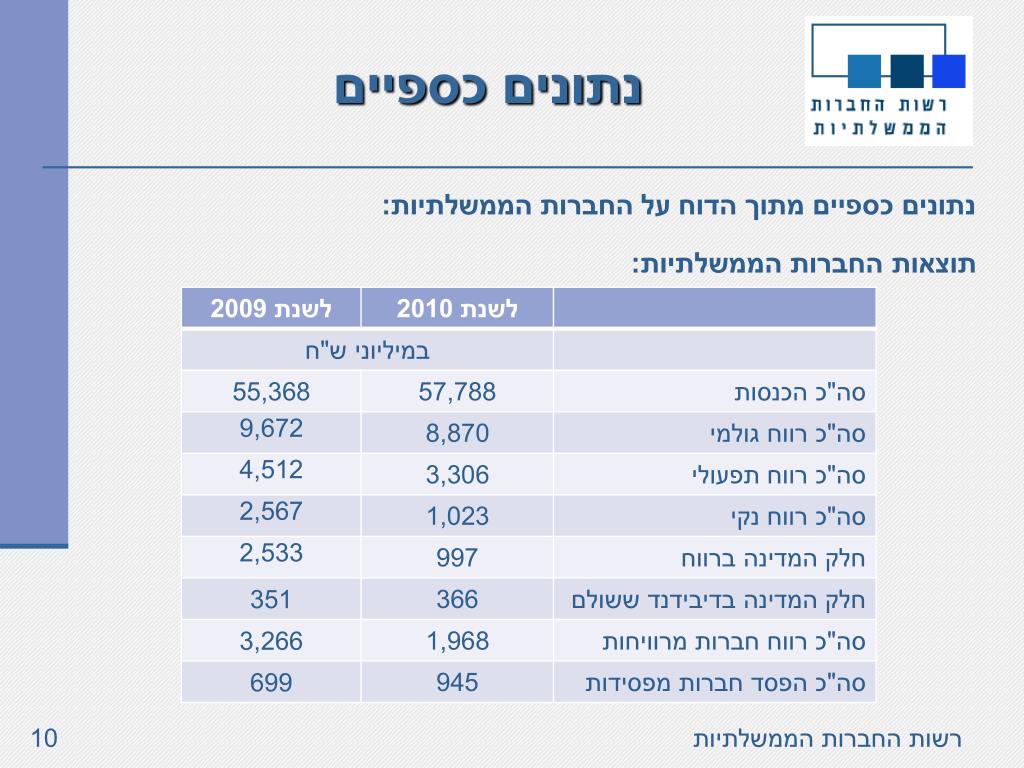 דוח על החברות הממשלתיות לשנת 2010. אוגוסט 2011. החברות הממשלתיות במספרים ב - 2010. 96 חברות ועמותות ממשלתיות כ-58 מיליארד ₪, הכנסות בשנת 2010 כ- 169 מיליארד ₪ סך מאזן של ליום 31.12.2010 כ- 57,600 עובדים בחברות ליום 31.12.10 כ- 14.6 מיליארד ₪ הכנסות מייצוא.