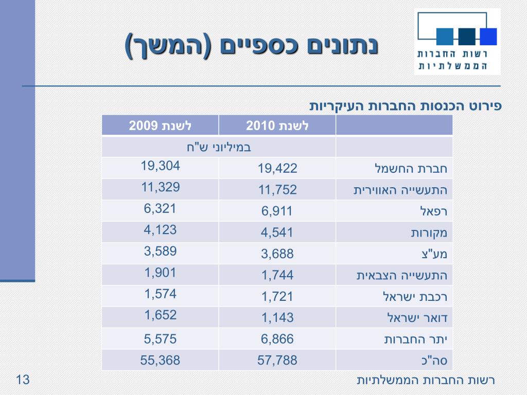 החברות הממשלתיות במספרים ב - 2010 96 חברות ועמותות ממשלתיות כ-58 מיליארד ₪, הכנסות בשנת 2010 כ- 169 מיליארד ₪ סך מאזן של ליום 31.12.2010 כ-57,600 עובדים בחברות ליום 31.12.10 כ- 14.6 מיליארד ₪ הכנסות מייצוא