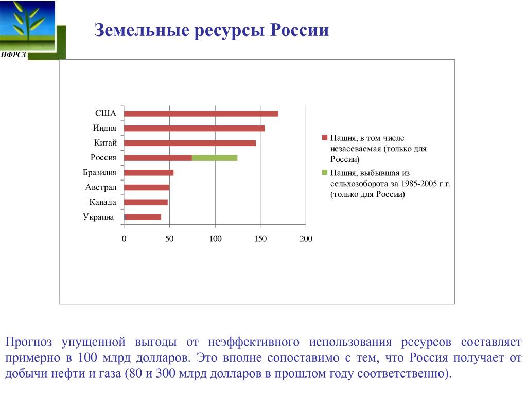 НФРСЗ Земельные ресурсы России Прогноз упущенной выгоды от неэффективного использования ресурсов составляет примерно в 100 млрд долларов. Это вполне сопоставимо с тем, что Россия получает от добычи нефти и газа (80 и 300 млрд долларов в прошлом году соответственно).
