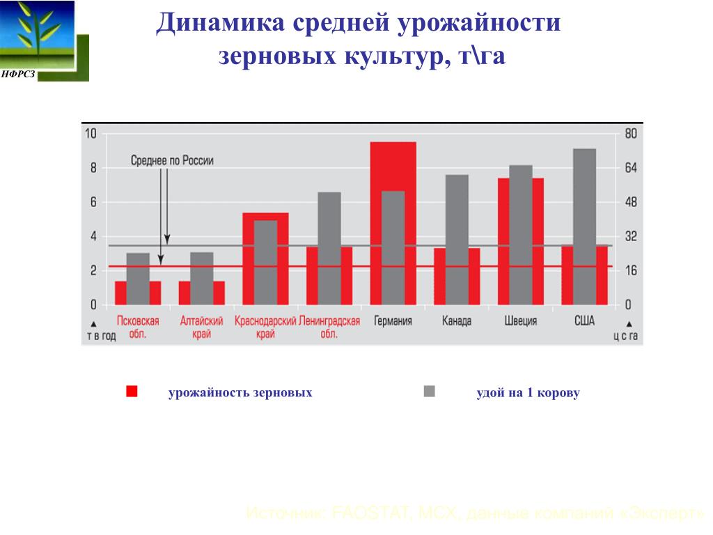 НФРСЗ Динамика средней урожайности зерновых культур, т\га урожайность зерновых удой на 1 корову Источник: FAOSTAT, МСХ, данные компаний «Эксперт»