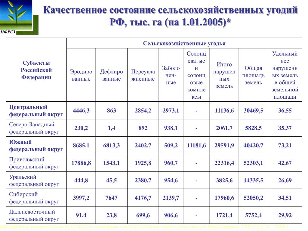 НФРСЗ Качественное состояниесельскохозяйственных угодий РФ, тыс. га (на 1.01.2005)* * Государственный (национальный) доклад о состоянии и использовании земель российской Федерации в 2005 году. М., 2006 г.