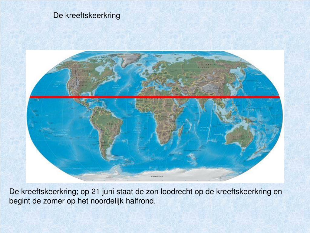 De kreeftskeerkring De kreeftskeerkring; op 21 juni staat de zon loodrecht op de kreeftskeerkring en begint de zomer op het noordelijk halfrond.