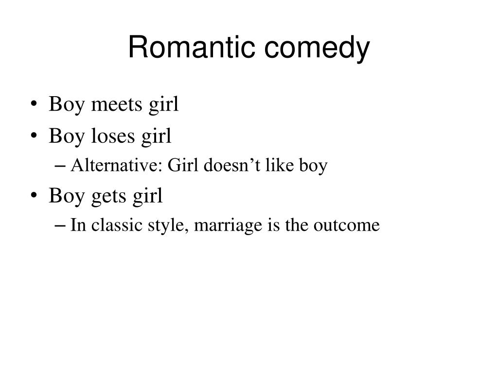 Romantic comedy • Boy meets girl • Boy loses girl • Alternative: Girl doesn’t like boy • Boy gets girl • In classic style, marriage is the outcome
