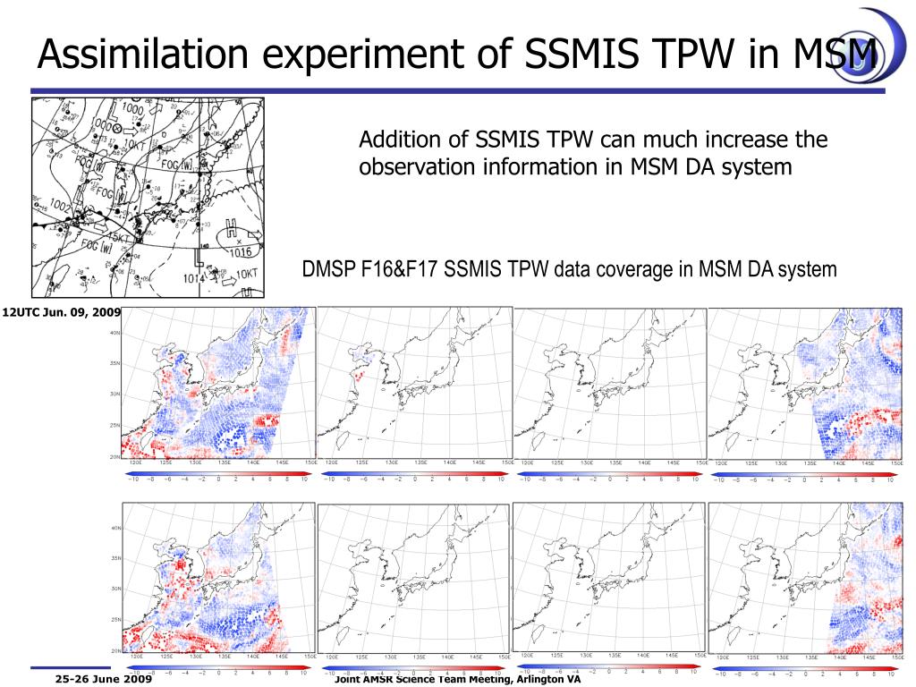 Assimilation experiment of SSMIS TPW in MSM Operational regional NWP model require much satellite data because rapid updated forecast is essential to provide timely information for disaster prevention SSMI Current data coverage (MW-PW,MW-RR&RA) in MSM DA system 12UTC Jun. 09, 2009 00 03 06 09 AMSR-E 12 15 18 21