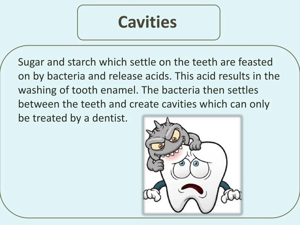 Cavities Sugar and starch which settle on the teeth are feasted on by bacteria and release acids. This acid results in the washing of tooth enamel. The bacteria then settles between the teeth and create cavities which can only be treated by a dentist.