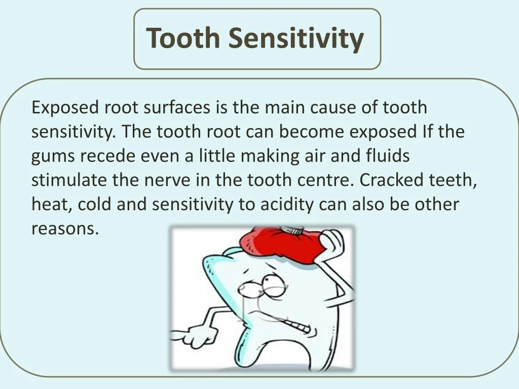 Tooth Sensitivity Exposed root surfaces is the main cause of tooth sensitivity. The tooth root can become exposed If the gums recede even a little making air and fluids stimulate the nerve in the tooth centre. Cracked teeth, heat, cold and sensitivity to acidity can also be other reasons.