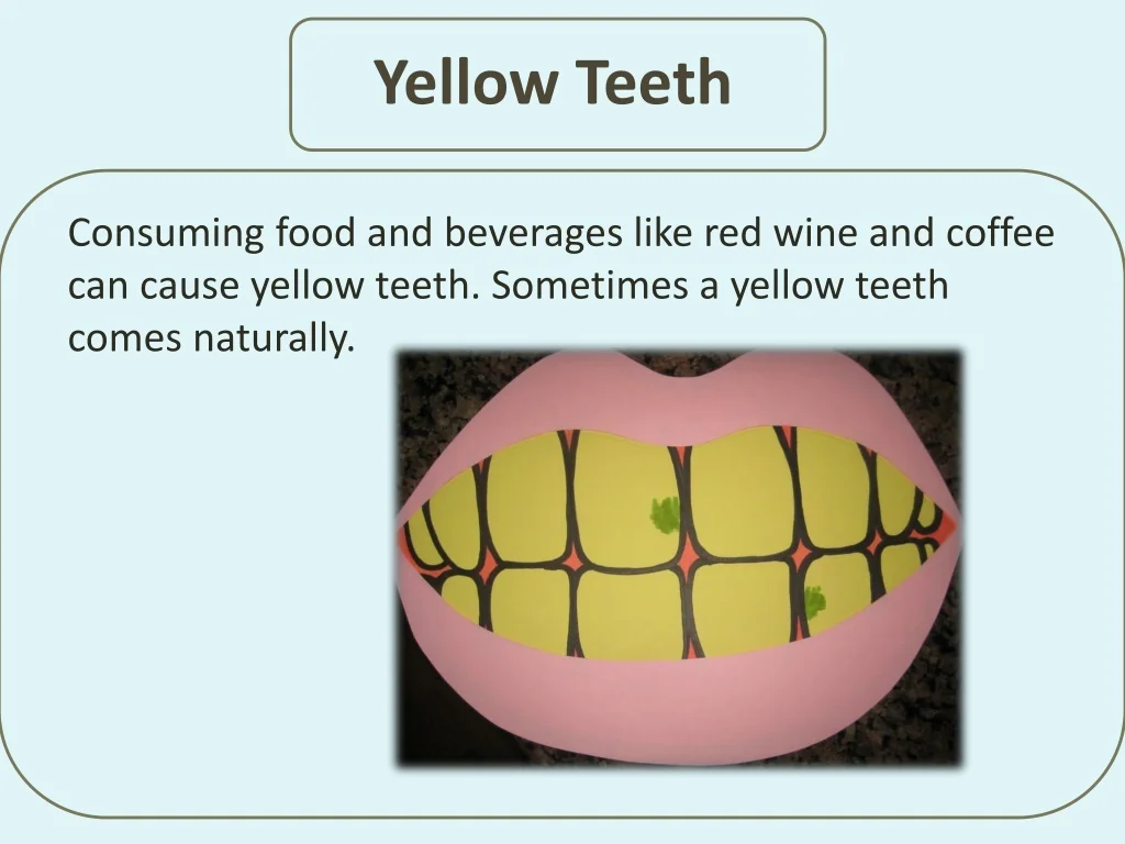 Yellow Teeth Consuming food and beverages like red wine and coffee can cause yellow teeth. Sometimes a yellow teeth comes naturally.