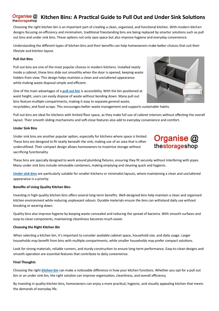 Discover how pull out bins and under sink bins improve kitchen organisation, hygiene, and space efficiency in modern homes.