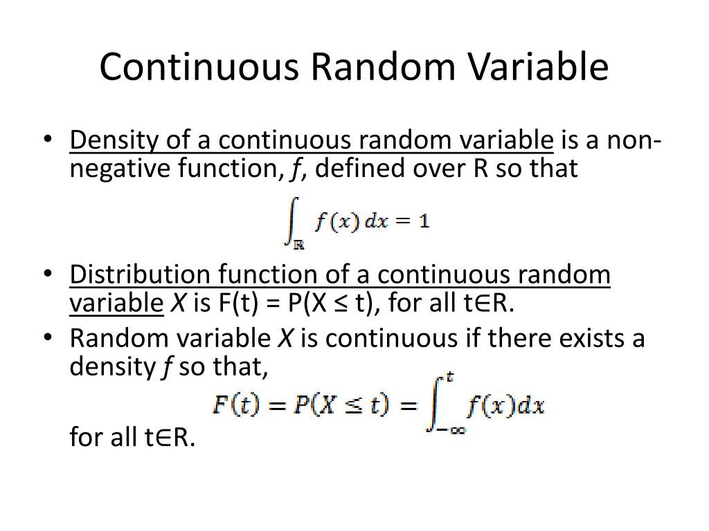 Continuous Random Variable • Density of a continuous random variable is a non-negative function, f, defined over R so that • Distribution function of a continuous random variableXis F(t) = P(X ≤ t), for all t∈R. • Random variable X is continuous if there exists a density f so that, for all t∈R.