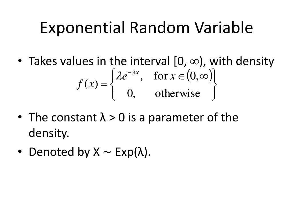 Exponential Random Variable • Takes values in the interval [0, ), with density • The constant λ > 0 is a parameter of the density. • Denoted by X ∼ Exp(λ).