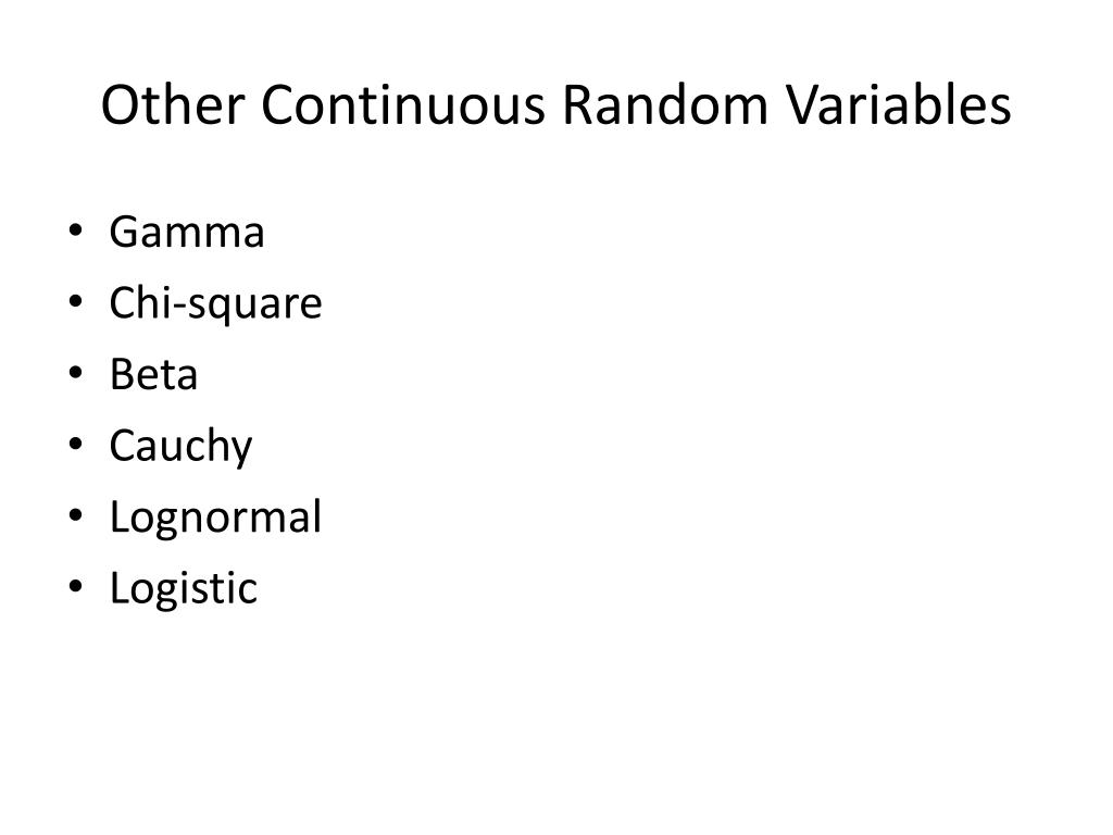 Other Continuous Random Variables • Gamma • Chi-square • Beta • Cauchy • Lognormal • Logistic