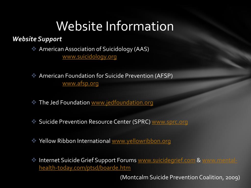 Website Information • Website Support • American Association of Suicidology (AAS) www.suicidology.org • American Foundation for Suicide Prevention (AFSP) www.afsp.org • The Jed Foundation www.jedfoundation.org • Suicide Prevention Resource Center (SPRC) www.sprc.org • Yellow Ribbon International www.yellowribbon.org • Internet Suicide Grief Support Forums www.suicidegrief.com & www.mental-health-today.com/ptsd/boarde.htm (Montcalm Suicide Prevention Coalition, 2009)