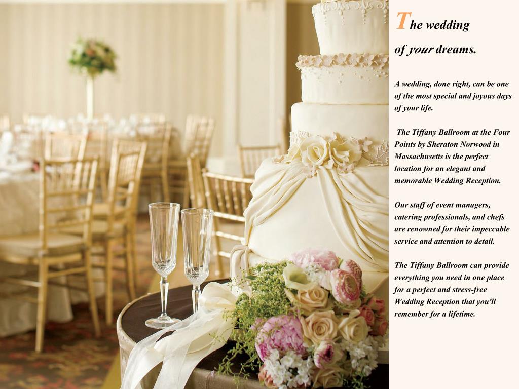 The weddingof your dreams.A wedding, done right, can be one of the most special and joyous days of your life. The Tiffany Ballroom at the Four Points by Sheraton Norwood in Massachusetts is the perfect location for an elegant and memorable Wedding Reception. Our staff of event managers, catering professionals, and chefs are renowned for their impeccable service and attention to detail. The Tiffany Ballroom can provide everything you need in one place for a perfect and stress-free Wedding Reception that you'll remember for a lifetime.