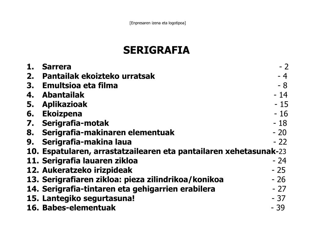 [Enpresaren izena eta logotipoa] SERIGRAFIA • Sarrera - 2 • Pantailak ekoizteko urratsak - 4 • Emultsioa eta filma - 8 • Abantailak - 14 • Aplikazioak - 15 • Ekoizpena - 16 • Serigrafia-motak - 18 • Serigrafia-makinaren elementuak - 20 • Serigrafia-makina laua - 22 • Espatularen, arrastatzailearen eta pantailaren xehetasunak-23 • Serigrafia lauaren zikloa - 24 • Aukeratzeko irizpideak - 25 • Serigrafiaren zikloa:pieza zilindrikoa/konikoa - 26 • Serigrafia-tintaren eta gehigarrien erabilera - 27 • Lantegiko segurtasuna!- 37 • Babes-elementuak - 39