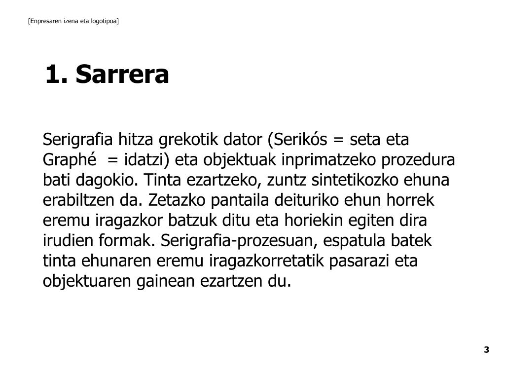 Serigrafia Ikastaroa. 02 berrikuspena. [Enpresaren izena eta logotipoa]. [Enpresaren izena eta logotipoa]. SERIGRAFIA. Sarrera - 2