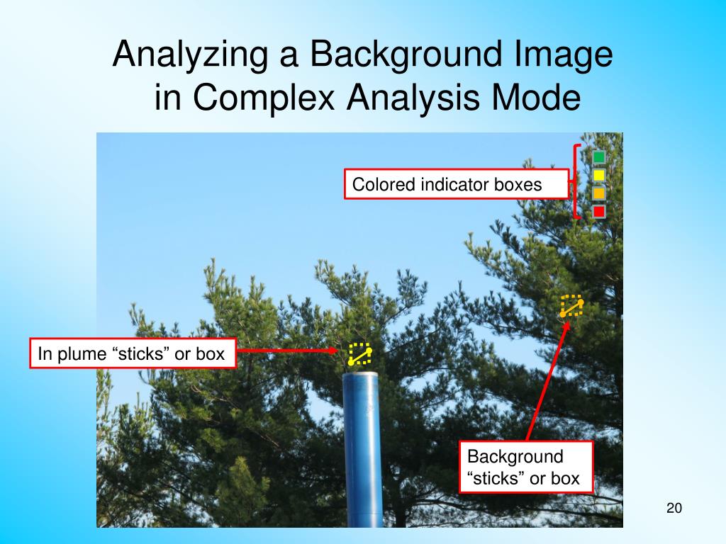 Analyzing a Background Image in Complex Analysis Mode Colored indicator boxes In plume “sticks” or box Background “sticks” or box